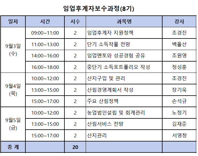 1. 임업후계자 보수과정 : 9월3일 ~5일(20시간) , 본 과정은 20시간 모두 실시간 온라인 줌(zoom)으로 진행합니다.