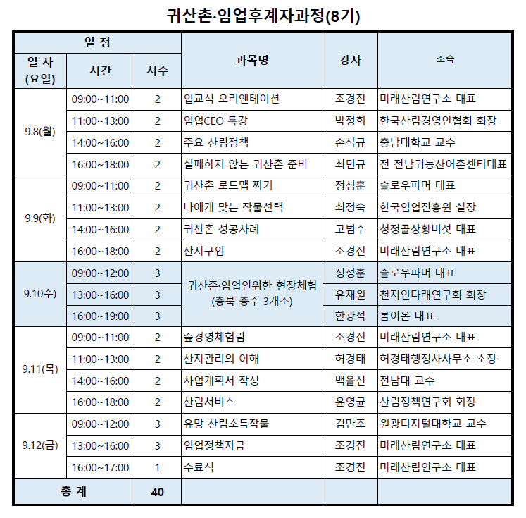 2. 귀산촌 및 임업후계자과정 : 9월 8일~12일(40시간) , 본 과정은 월, 화, 목, 금 4일은 온라인 줌(zoom)으로 진행하고